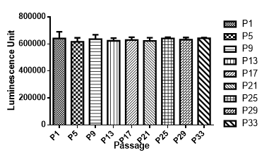 Figure. Stablity test results. NCI-H1975-Luc cells showed at least 32 passage stability with similar luminescence unit. | |