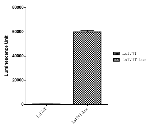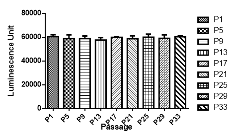 Figure. Stablity test results. LS174T-Luc cells showed at least 32 passage stability with similar luminescence unit. | |